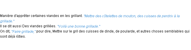 Définition du mot « grillade » par l’équipe de la-definition.fr (édition de 2011).Merci à Martine et Laurette pour la numérisation du mot grillade.