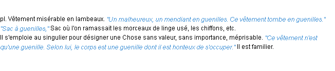 Définition du mot « guenilles » par l’Académie Française (édition de 1932).Merci à Mélanie et Henri pour la numérisation du mot guenilles.