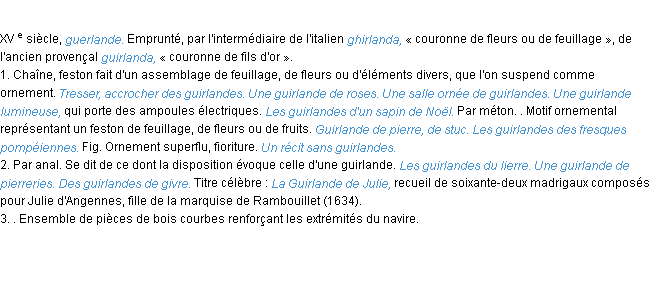 Définition du mot « guirlande » par l’équipe de la-definition.fr (édition de 2011).Merci à Pascal et émilie pour la numérisation du mot guirlande.
