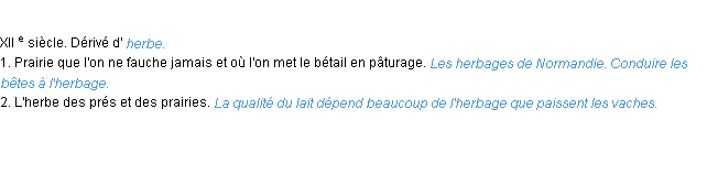 Ancienne définition développée dans dictionnaire académique, 1798.Merci à Armand et Amélie pour la numérisation du mot herbage.