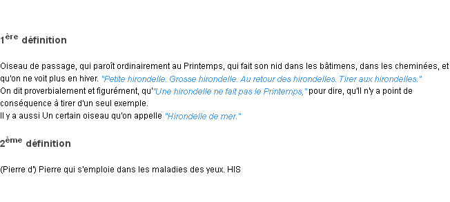Définition de l’équipe de la-definition.fr (édition de 2009) pour le mot « hirondelle ».Merci à Jolie et Rémy pour la numérisation du mot hirondelle.