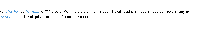 Signification éditée en 2008 pour le terme « hobby » par l’équipe de wiktionary France.Merci à Florentin et Serge pour la numérisation du mot hobby.