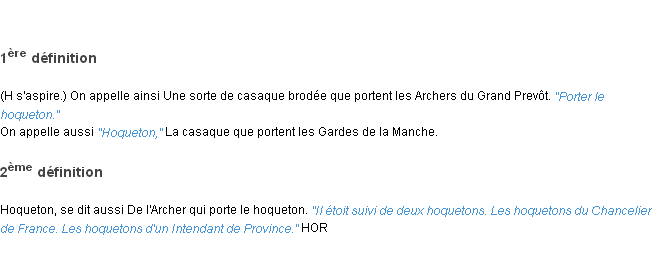 Ancienne signification développée en 1798 par l’académie Française (ACAD - 1798).Merci à Fabien et Placide pour la numérisation du mot hoqueton.