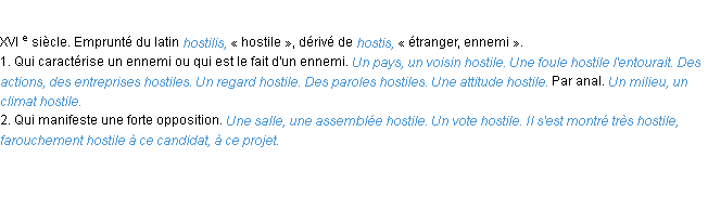 Signification éditée en 2010 par l’équipe de la-definition.fr.Merci à Noel et Frédérique pour la numérisation du mot hostile.