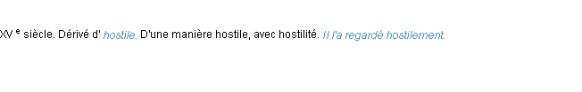 Définition « hostilement » du dictionnaire académique Français, parution de l’année 1932.