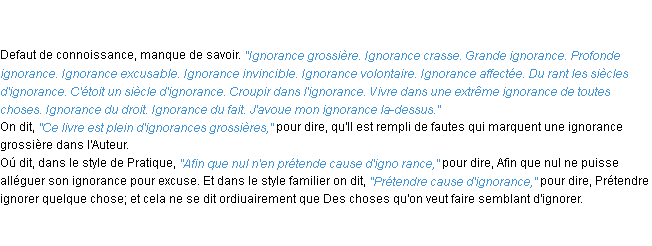 Signification éditée en 1932 pour le terme « ignorance » par l’Académie Française.