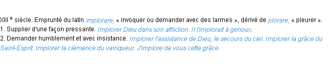 Ancienne signification parue en 1798 dans dictionnaire de l’Académie Française.Merci à Charlot et Henriette pour la numérisation du mot implorer.
