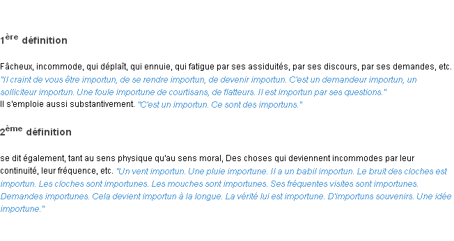 Ancienne signification parue en 1798 dans dictionnaire de l’Académie Française.Merci à Lydie et Papillion pour la numérisation du mot importun.