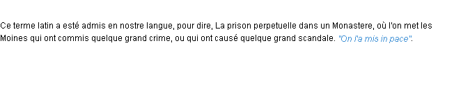Ancienne signification issue du dico de l’Académie Française, parue en 1694.Merci à Gaetane et Nicolette pour la numérisation du mot in pace.