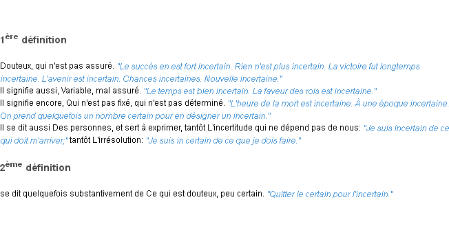 Ancienne signification du terme « incertain », parution de 1835, dictionnaire académique Français.