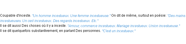 Ancienne signification issue du dico de l’Académie Française, parue en 1798.Merci à Lucie et Maximilienne pour la numérisation du mot incestueux.