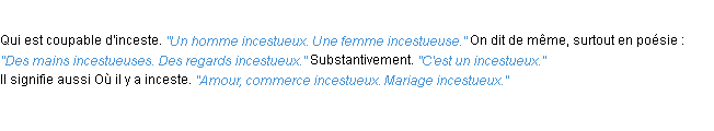 Définition de « incestueux » de source académique (Académie Française, parution de 1932).