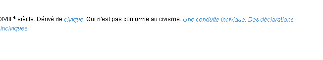Ancienne signification développée en 1798 par l’académie Française (ACAD - 1798).Merci à Tatienne et Angelique pour la numérisation du mot incivique.