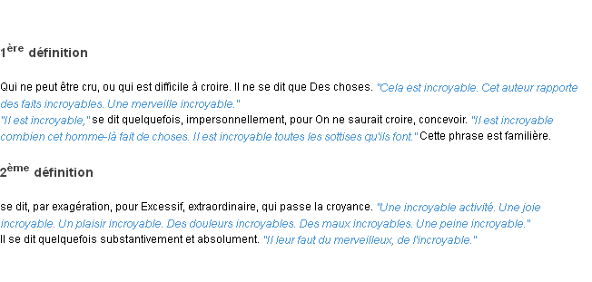 Définition de « incroyable » de source académique (Académie Française, parution de 1986).
