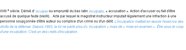 Ancienne signification développée en 1798 par l’académie Française (ACAD - 1798).Merci à Sévérine et Sylvestre pour la numérisation du mot inculpation.
