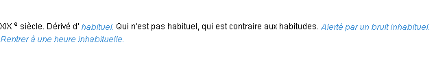 Définition du mot « inhabituel » par Emile Littré (édition de 1876).Merci à Gisèle et Léa pour la numérisation du mot inhabituel.