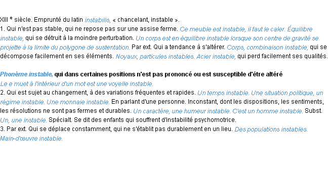 Signification éditée en 1986 pour le terme « instable » par l’Académie Française.