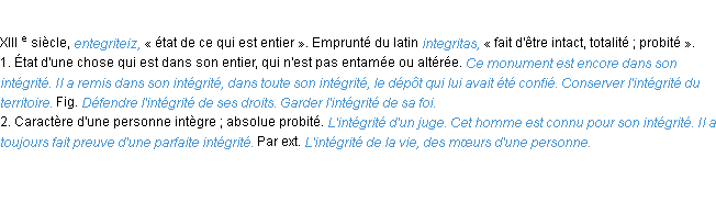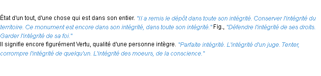 Ancienne signification parue en 1798 dans dictionnaire de l’Académie Française.Merci à Damien et Mariette pour la numérisation du mot intégrité.