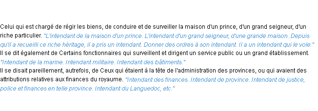 Ancienne signification éditée en 1835 pour le terme « intendant » par l’Académie Française.