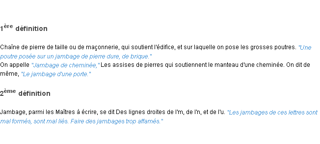 Ancienne signification développée en 1798 par l’académie Française (ACAD - 1798).Merci à Perceval et Adrienne pour la numérisation du mot jambage.