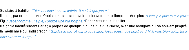 Ancienne signification du terme « jaser », parution de 1798, dictionnaire académique Français.Merci à Frédéric et Tatienne pour la numérisation du mot jaser.