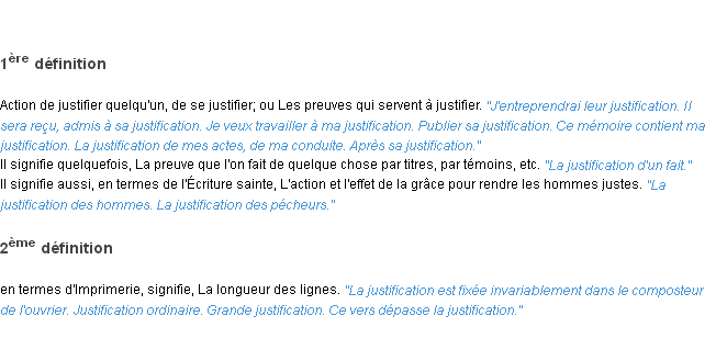 Ancienne signification du terme « justification », parution de 1798, dictionnaire académique Français.Merci à Fiacre et Nicolas pour la numérisation du mot justification.