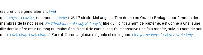 Ancienne signification du terme « lady », parution de 1798, dictionnaire académique Français.Merci à Jeannot et Jérôme pour la numérisation du mot lady.