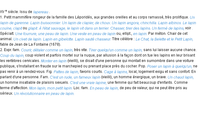 Ancienne signification parue en 1798 dans dictionnaire de l’Académie Française.Merci à Henriette et Claudine pour la numérisation du mot lapin.
