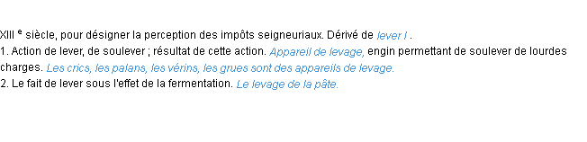 Définition de « levage » issue du Littré (Auteur Emile Littré, édité en 1876).