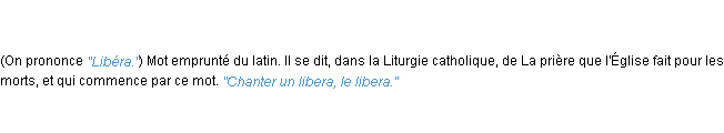 Ancienne définition de l’Académie Française (édition de 1798) pour le mot « libera ».Merci à Dominique et Dominique pour la numérisation du mot libera.