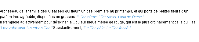 Définition académique pour le terme « lilas » (parue en 1986).