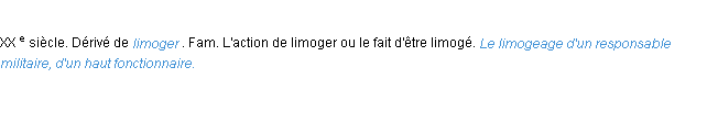 Définition issue du dictionnaire wiktionary pour le mot « limogeage ».Merci à Sylvie et Perrine pour la numérisation du mot limogeage.
