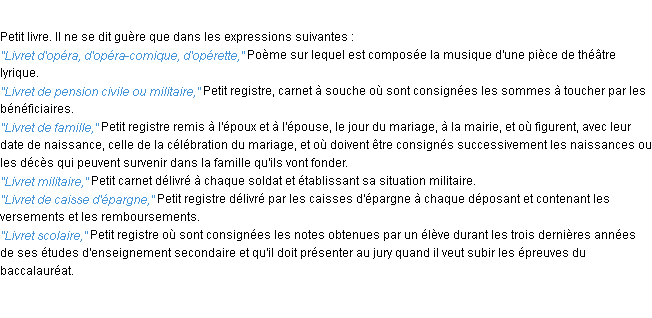 Définition « livret » du dictionnaire académique Français, parution de l’année 1932.