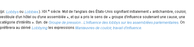 Signification éditée en 2008 pour le terme « lobby » par l’équipe de wiktionary France.