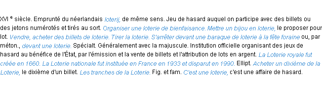 Ancienne signification issue du dico de l’Académie Française, parue en 1798.Merci à Martine et Jolie pour la numérisation du mot loterie.