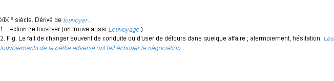 Définition de « louvoiement » de source académique (Académie Française, parution de 1986).Merci à Hélène et Gratien pour la numérisation du mot louvoiement.