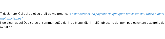 Ancienne signification développée en 1798 par l’académie Française (ACAD - 1798).Merci à Gwenaelle et Bernadette pour la numérisation du mot mainmortable.