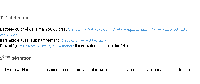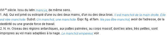 Ancienne définition « manchot » du dictionnaire académique Français, parution de l’année 1798.