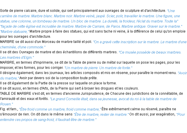 Ancienne définition de « marbre » de source académique (Académie Française, parution de 1798).