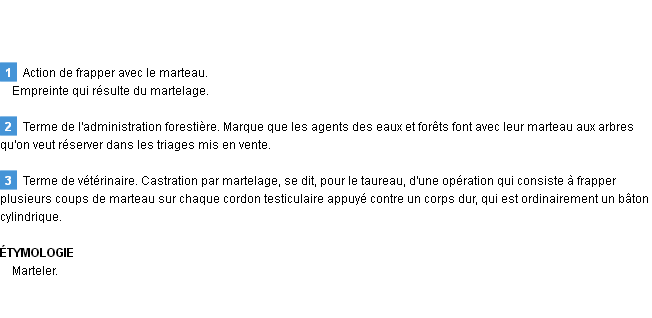Signification éditée en 1876 pour le terme « martelage » par Emile Littré.Merci à Doriane et Suzette pour la numérisation du mot martelage.