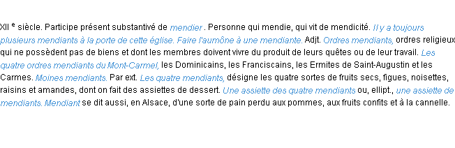 Signification du terme « mendiant », parution de 1932, dictionnaire académique Français.