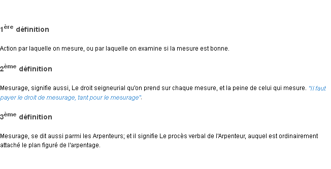 Signification du terme « mesurage », parution de 1932, dictionnaire académique Français.