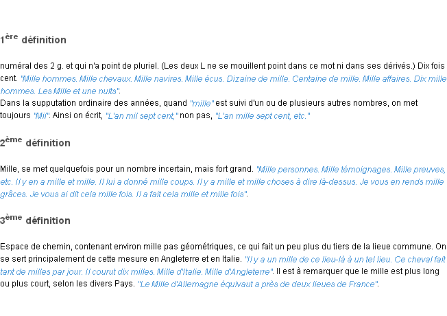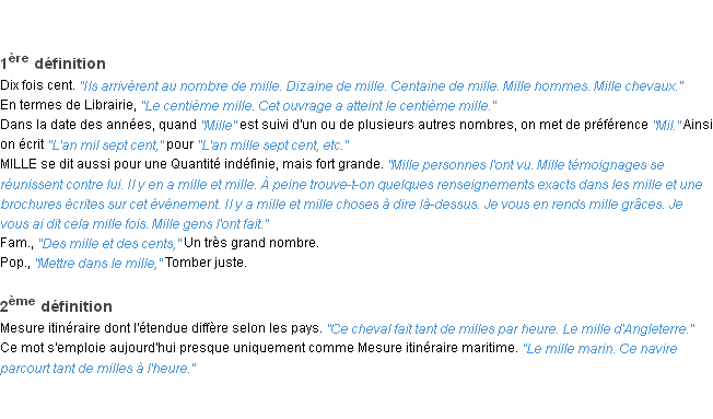 Ancienne définition du mot « mille » par l’Académie Française (édition de 1835).