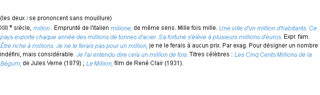 Ancienne signification parue en 1798 dans dictionnaire de l’Académie Française.Merci à Evrard et Joelle pour la numérisation du mot million.