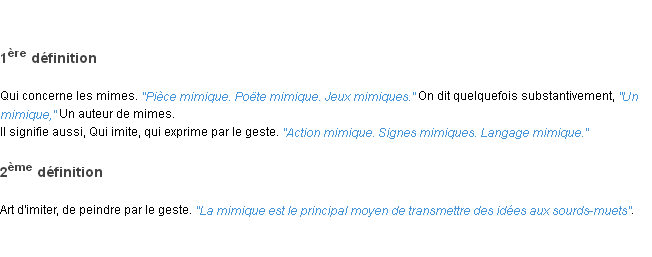 Définition développée dans dictionnaire d’Emile Littré (ancienne édition de 1876).Merci à Charlot et Solange pour la numérisation du mot mimique.