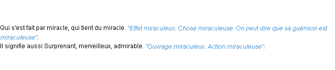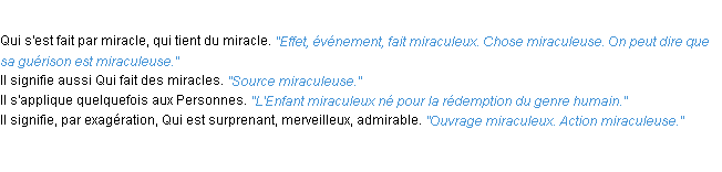 Ancienne signification parue en 1798 dans dictionnaire de l’Académie Française.Merci à Armelle et Juliette pour la numérisation du mot miraculeux.