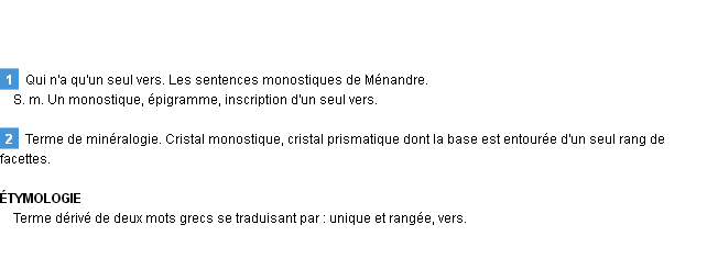 Définition développée dans dictionnaire d’Emile Littré (ancienne édition de 1876).Merci à Renaud et Sylvestre pour la numérisation du mot monostique.