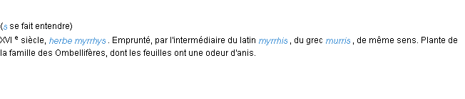 Ancienne définition du mot « myrrhis » par l’Académie Française (édition de 1798).Merci à élodie et Firmin pour la numérisation du mot myrrhis.