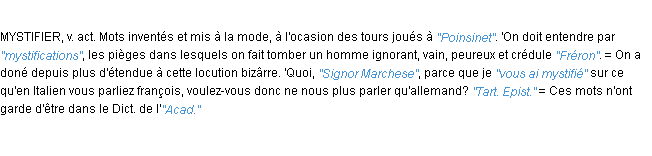 Signification du terme « mystification », parution de 1788 (dictionnaire de Mr Féraud).Merci à Colombain et Paule pour la numérisation du mot mystification.