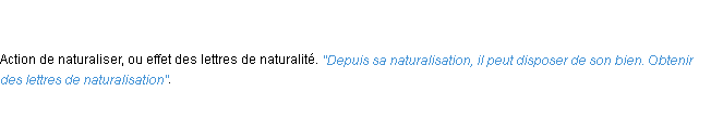 Ancienne signification développée en 1798 par l’académie Française (ACAD - 1798).Merci à Cerise et Blaise pour la numérisation du mot naturalisation.